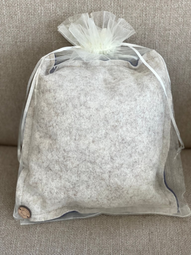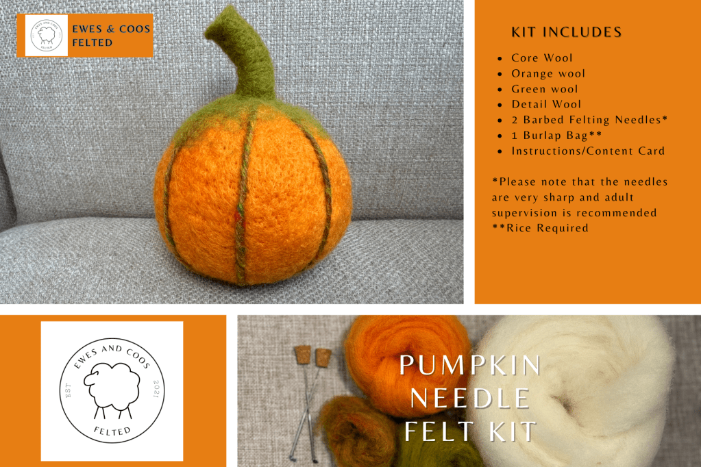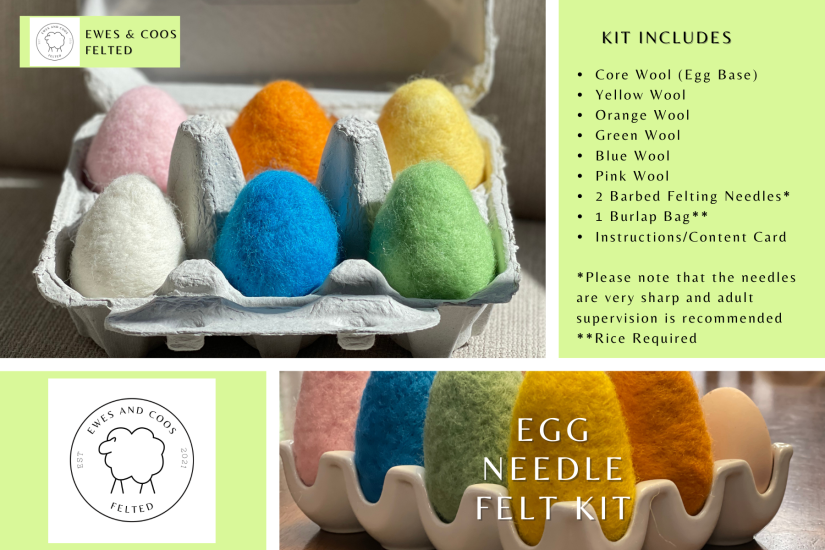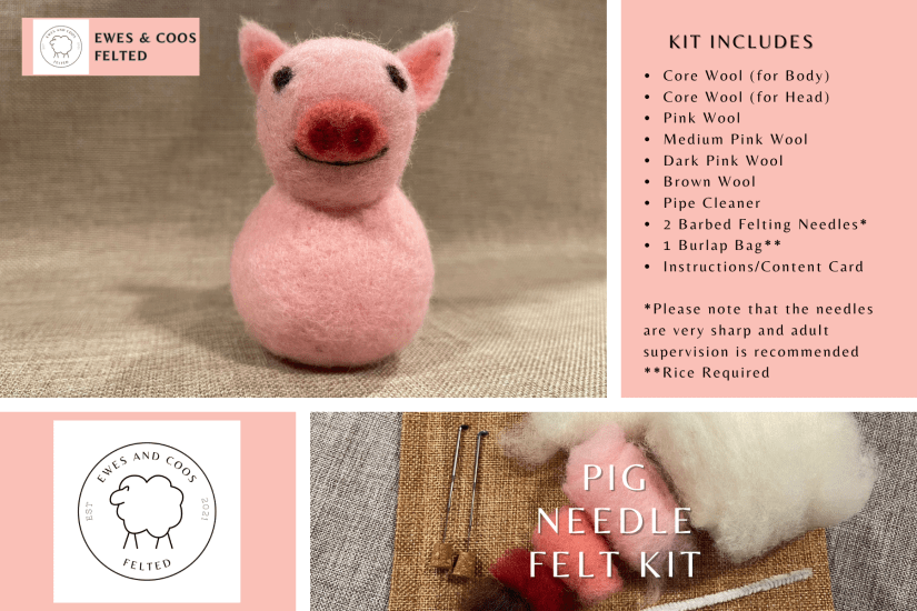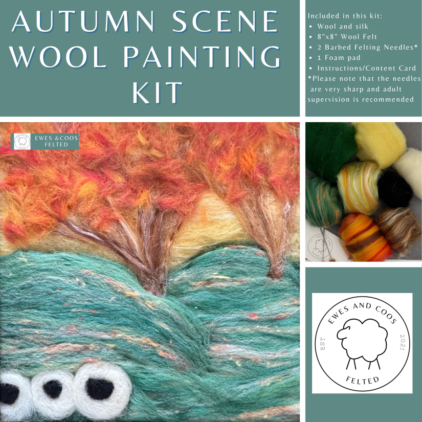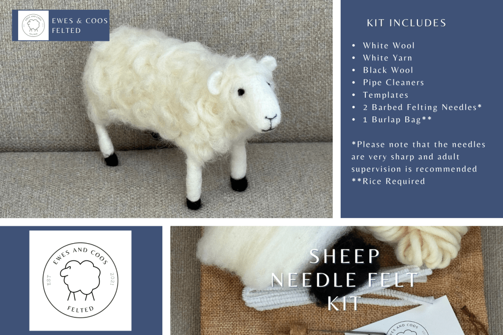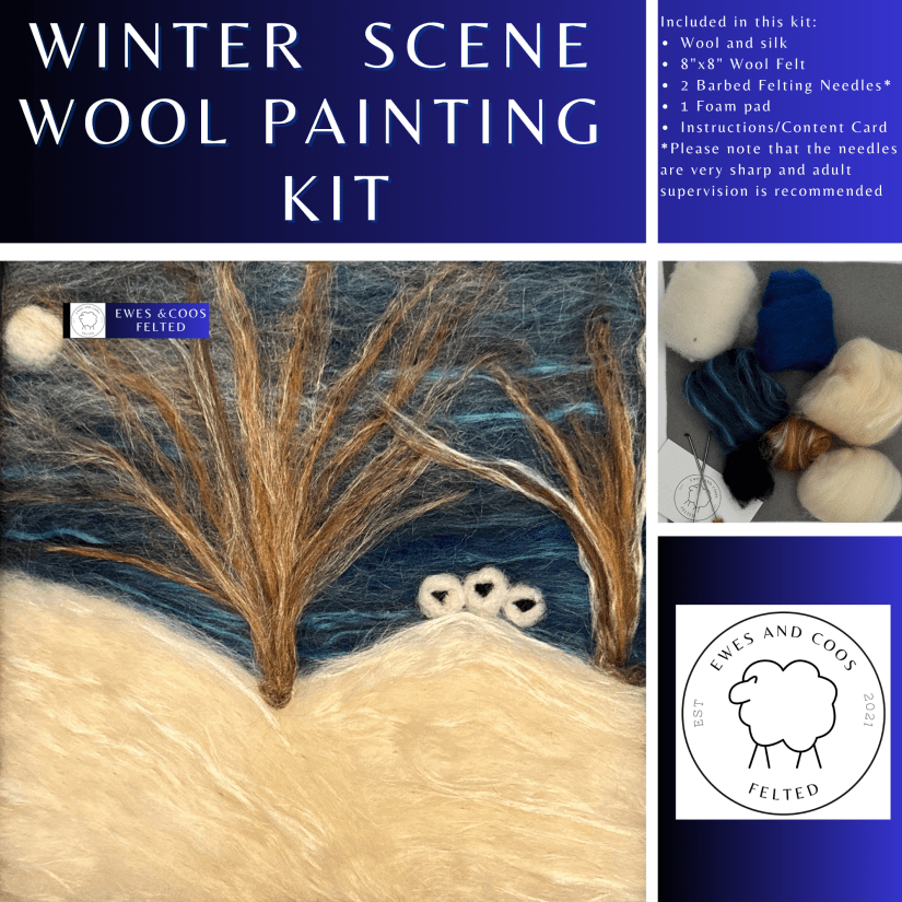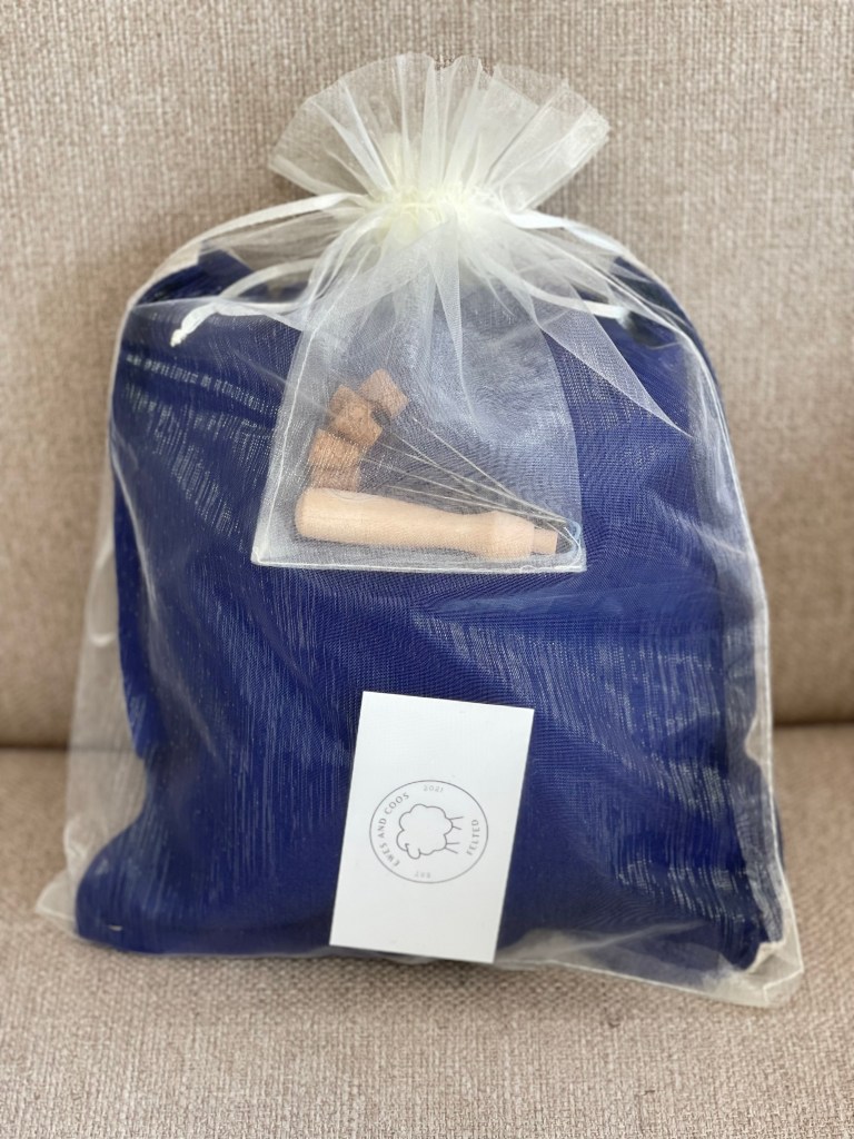 This kit includes a 100%wool hand made Needle Felt pad, dark side (blue) and light side (grey), one needle holder and two coarse needles (green), two medium needles (blue) and two finishing needles (light blue).